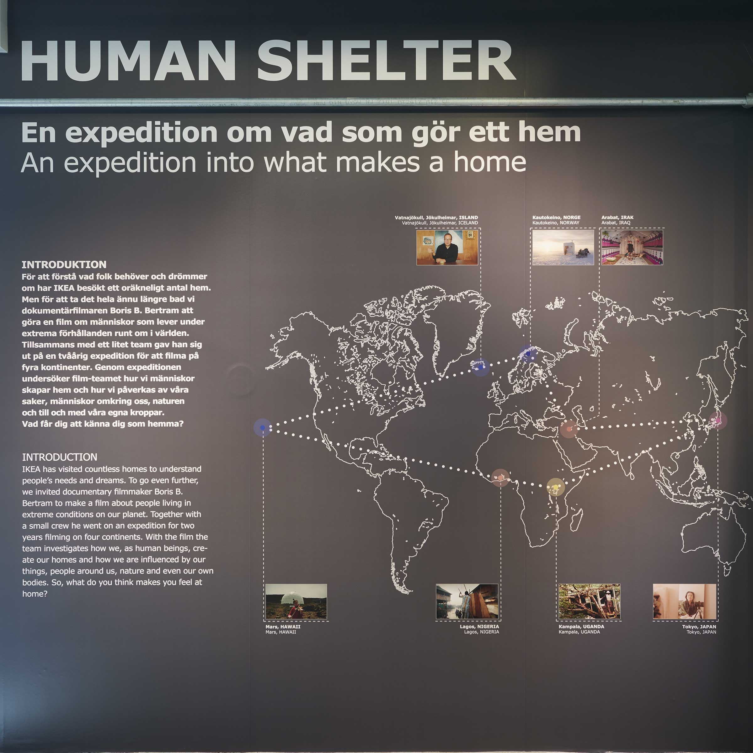 On 21 March, IKEA Museum is opening a new exhibition that is based on this documentary film. The exhibition “Human Shelter”, explores the seven chapters of the film with unique behind the scenes material as well as never before seen clips, combined with photos and stills from the expedition.